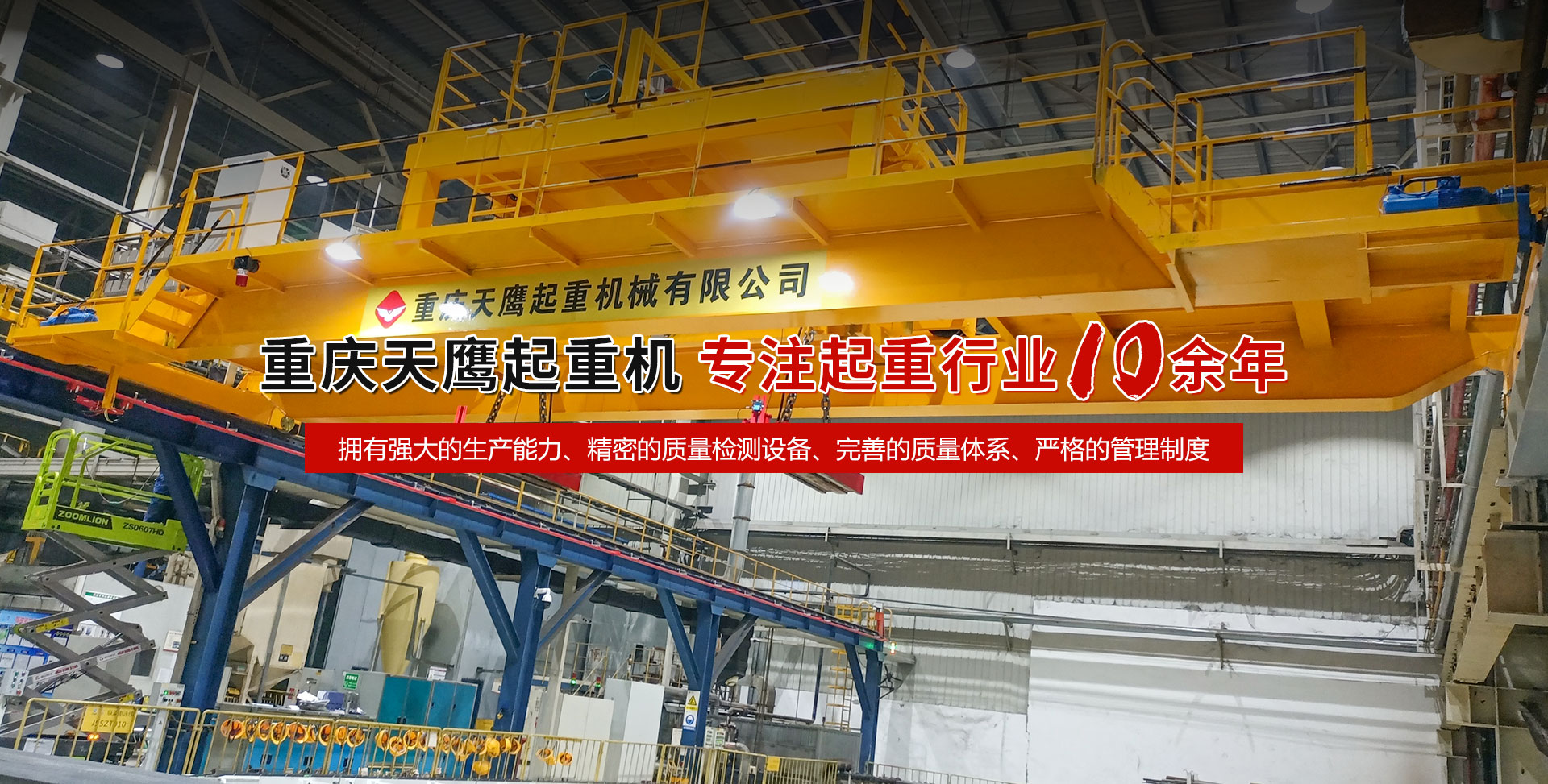 重慶天鷹起重機械有限公司成立于2014年,主營起重機的銷售、安裝和維護等相關服務。中國重型機械工業(yè)協(xié)會員單位、為中國工程機械工業(yè)協(xié)會工程機械維修分會會員單位及西南地區(qū)起重機械定點安裝維修單位。具有國家質(zhì)量監(jiān)督檢疫總局頒發(fā)的特種設備安裝維修改造質(zhì)格證書。并率先通過了IS09001-2000質(zhì)量體系認證。 公司注冊資金3000萬元;廠房面積2萬平方米;各種生產(chǎn)檢測設備50臺套,公司技術力量雄厚,聘請了國內(nèi)知名起重機專家、工程技術人員擔當項目經(jīng)理、技術總工程師及顧問。現(xiàn)擁有員工100多人,其中工程技術人員12人。 主導產(chǎn)品為各類橋、門式起重機及輕小型起重設備,具備生產(chǎn)起重量200t及以下通用橋、門式起重機的能力,尤其在200t以下起重機產(chǎn)品上具備較強的市場競爭力,為許多行業(yè)設計制造了技術含量高、技術性強的起重設備,許多產(chǎn)品在原設計標準上進行了較大的改進、優(yōu)化和創(chuàng)新;其中NH型系列電動葫蘆、HD型電動單梁處于國內(nèi)高水平..... 好的產(chǎn)品品質(zhì)需要由較高的裝備水平來保證,公司購買了“大型數(shù)控落地鏜”、“數(shù)控切割機床”、“自調(diào)式焊接滾輪機”、“數(shù)顯液壓板料折彎機”、“超大型數(shù)控臥式車床”、“數(shù)控液壓水平下調(diào)式三輥卷板機”、“單柱移動式立式車床”“擁有用于單梁生產(chǎn)的全國一條拋丸噴漆烘干線、葫蘆噴漆烘干線和全國較大的100T葫蘆試驗臺和檢測中心”等各種先進的加工設備,新建廠房面積近2萬平方米。 質(zhì)量是企業(yè)的生命,天鷹公司依據(jù)“ISO 9001國際質(zhì)量管理體系”標準,制定并完善了公司的質(zhì)量管理體制。堅持質(zhì)量體系的內(nèi)審和外審,將質(zhì)量管理工作落實到企業(yè)生產(chǎn)經(jīng)營的全過程。 您的微笑,是天鷹永恒的追求;天鷹的服務,是您首要的選擇!因為我們堅信:“誠信是本、質(zhì)量鑄就品牌”。為您服務是我們的榮耀,勤奮而進取的天鷹人,時刻期盼著您的到來。